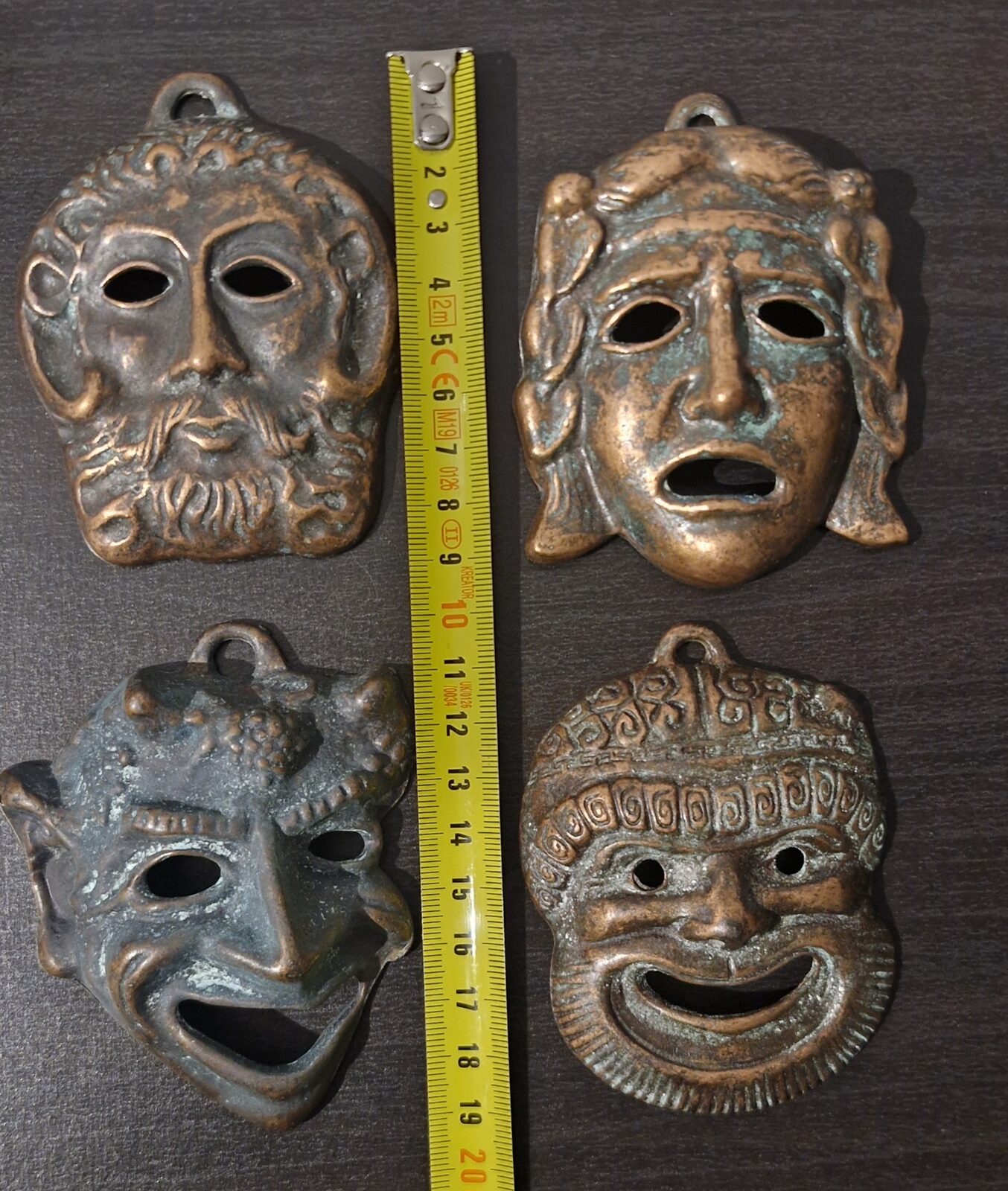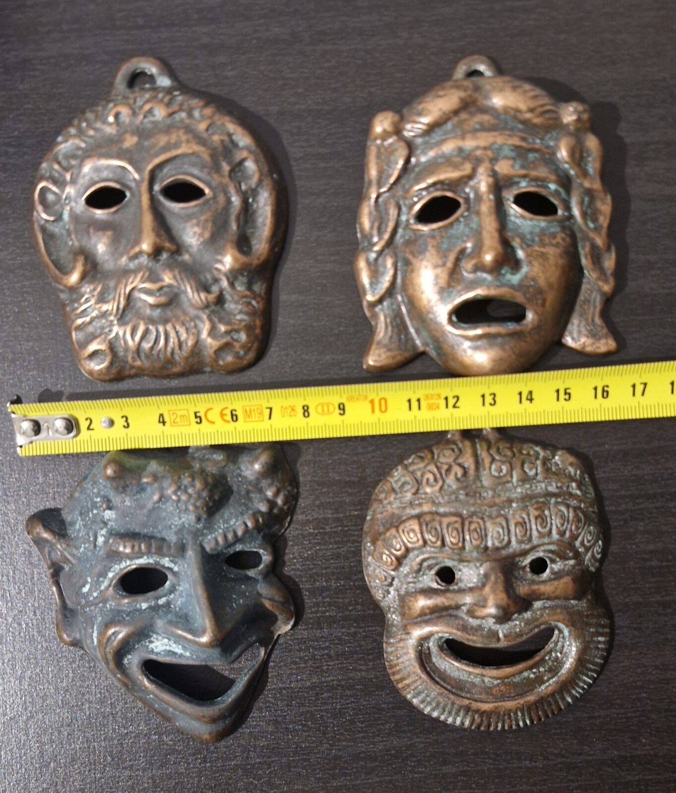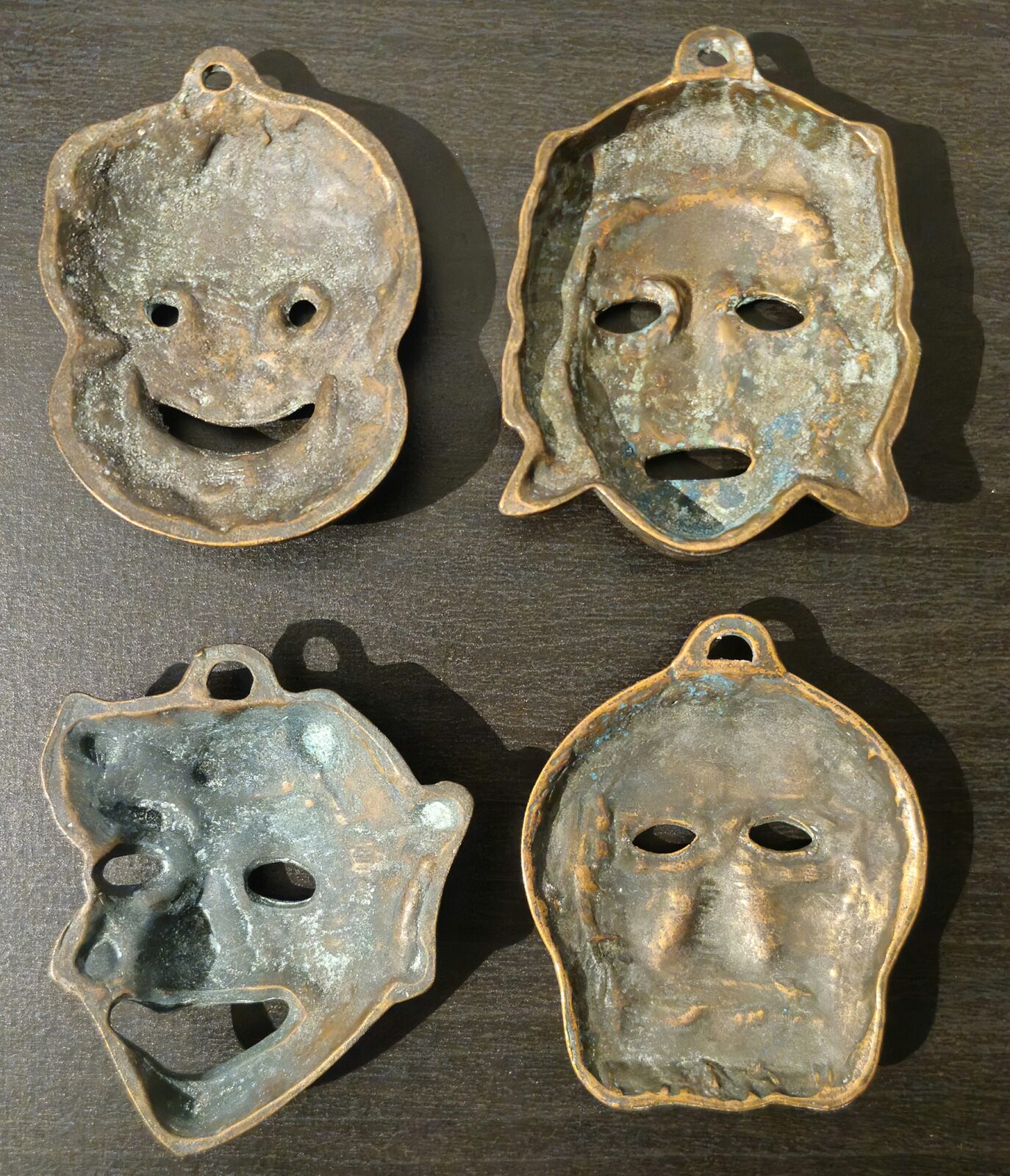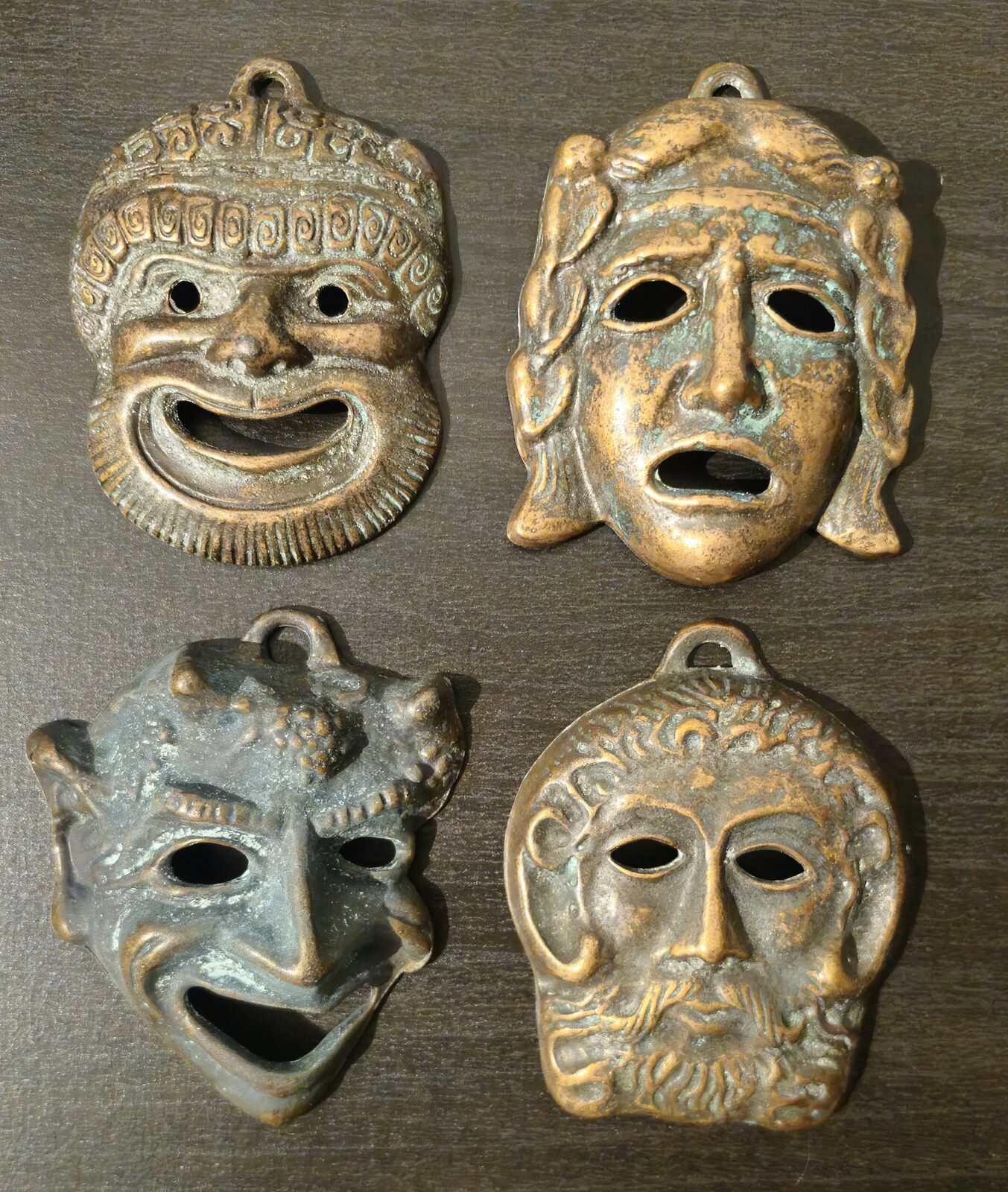 A characterful group of Greek theatre–inspired masks, cast in non-magnetic brass/bronze alloy with a naturally aged patina. These masks represent classical expressions used in Ancient Greek drama: