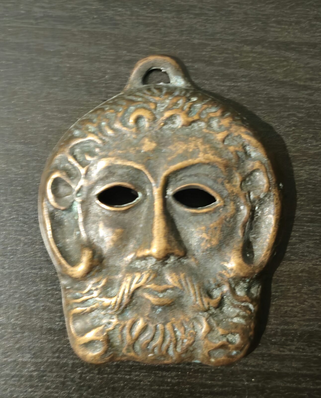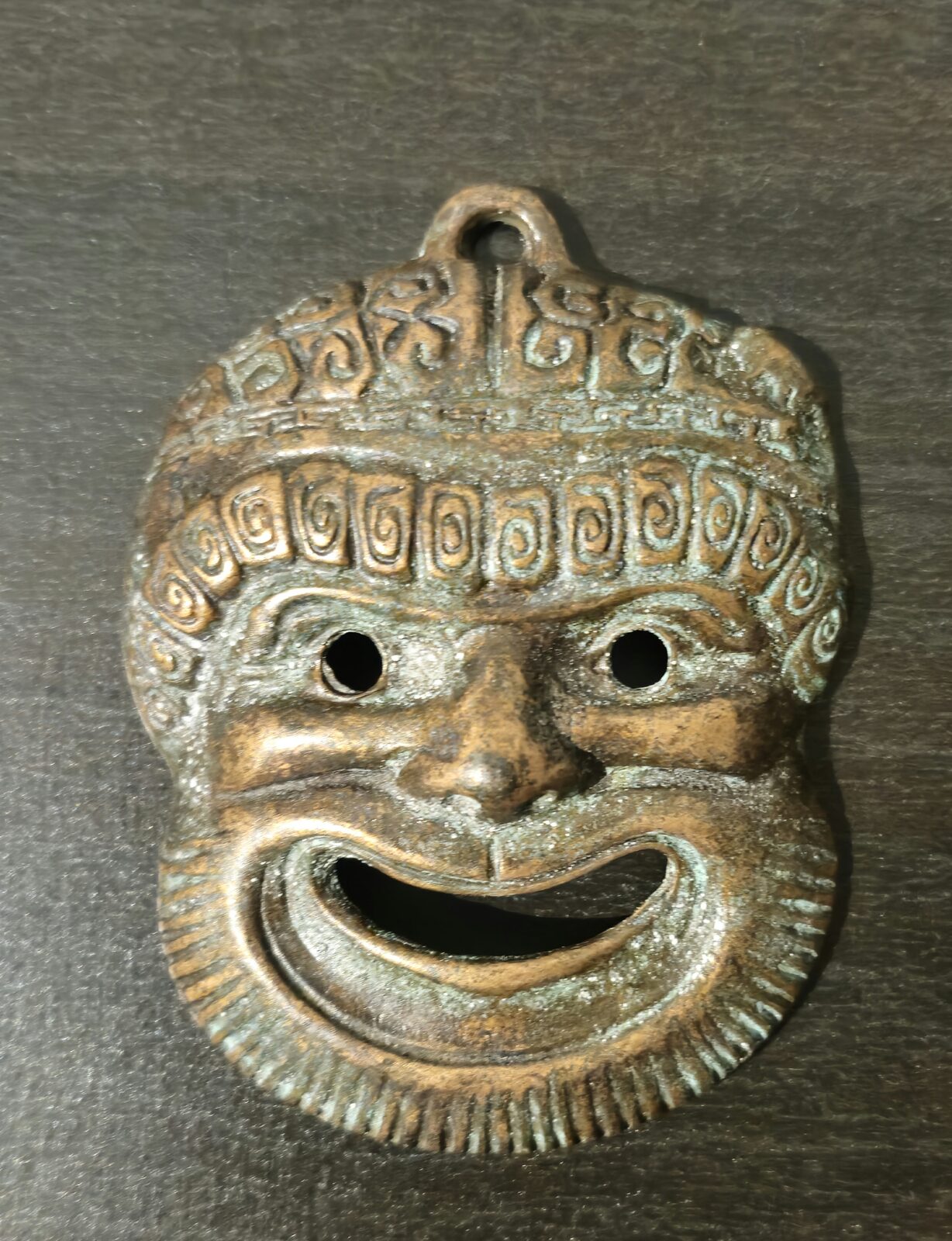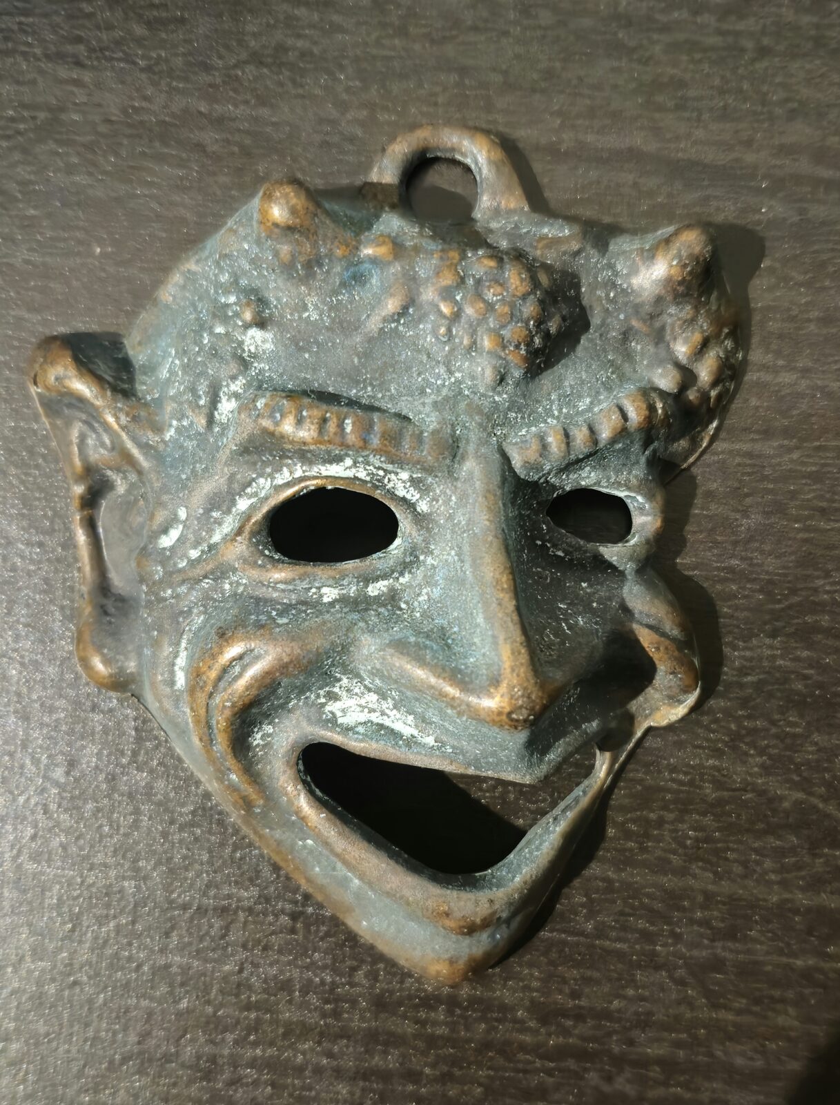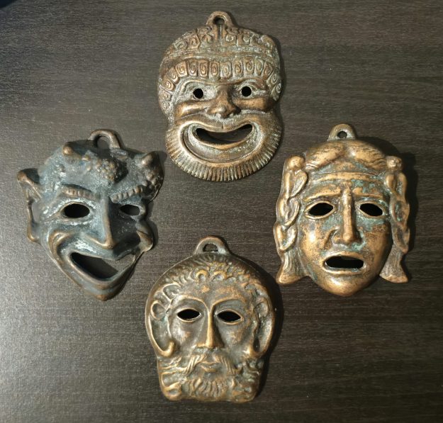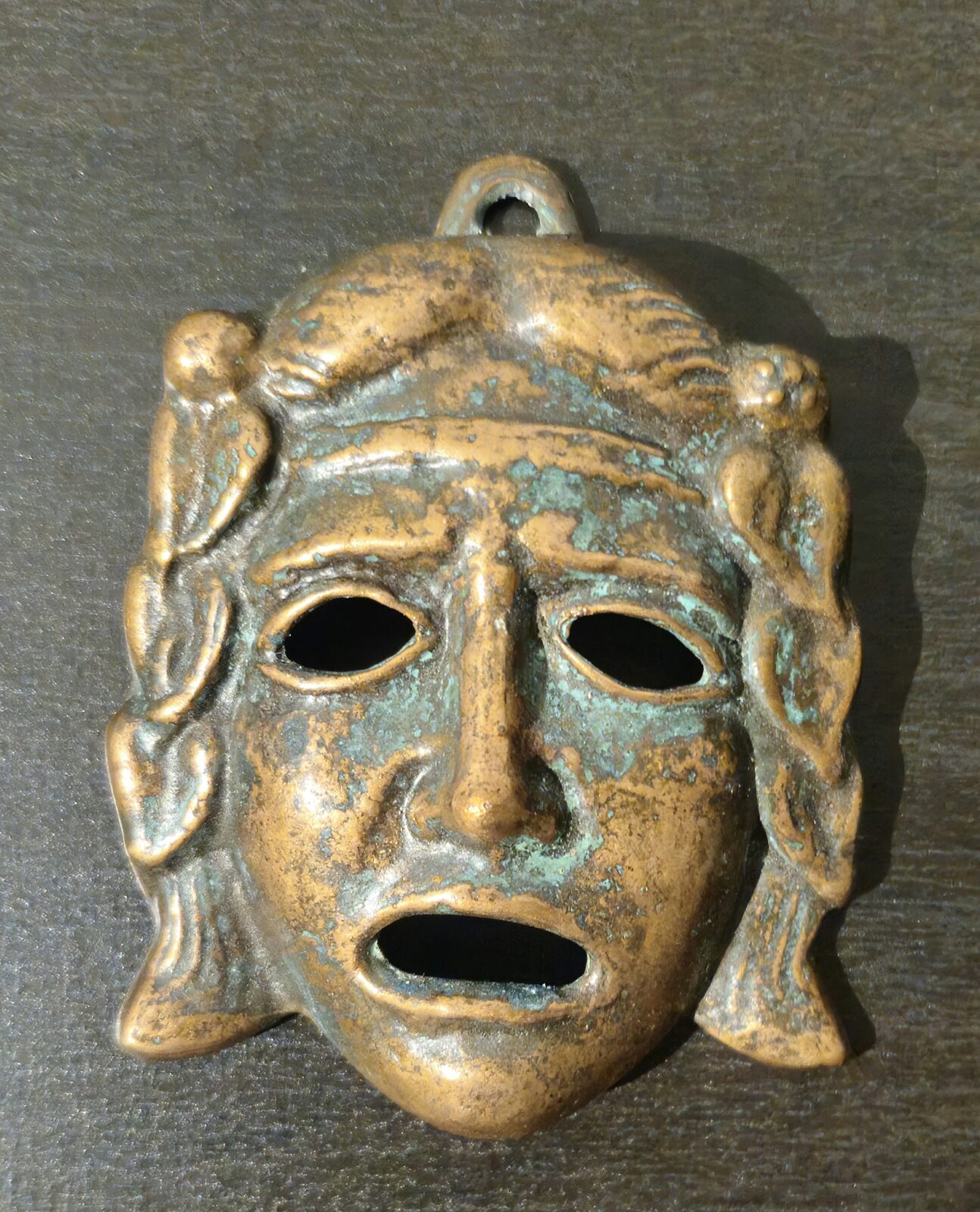 A characterful group of Greek theatre–inspired masks, cast in non-magnetic brass/bronze alloy with a naturally aged patina. These masks represent classical expressions used in Ancient Greek drama: