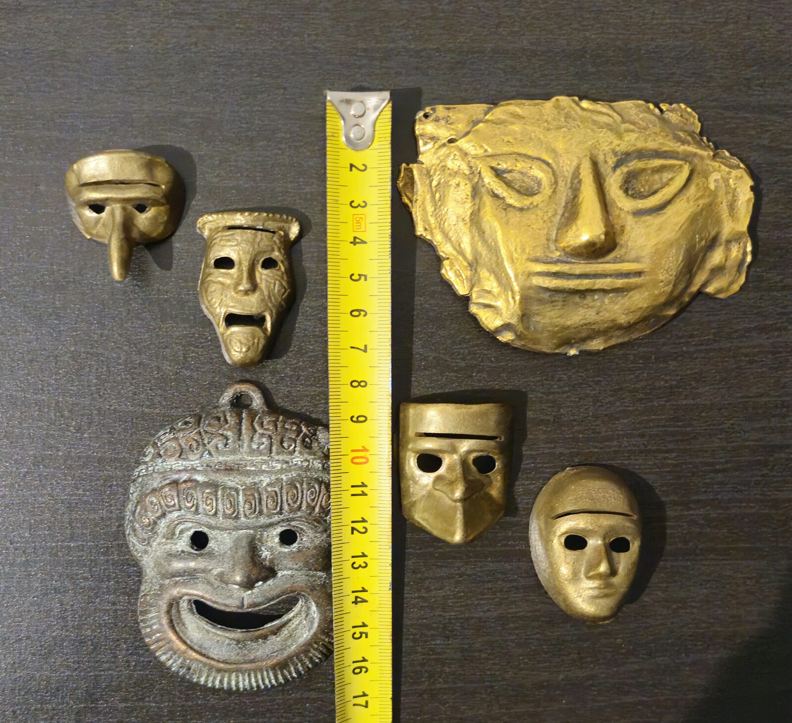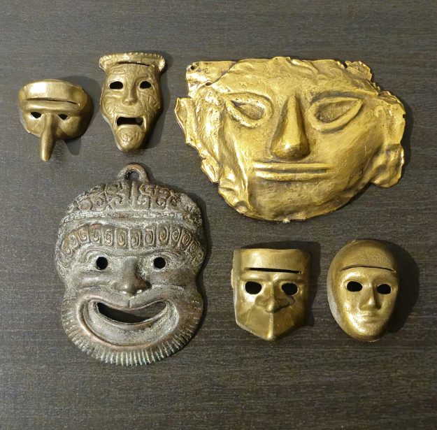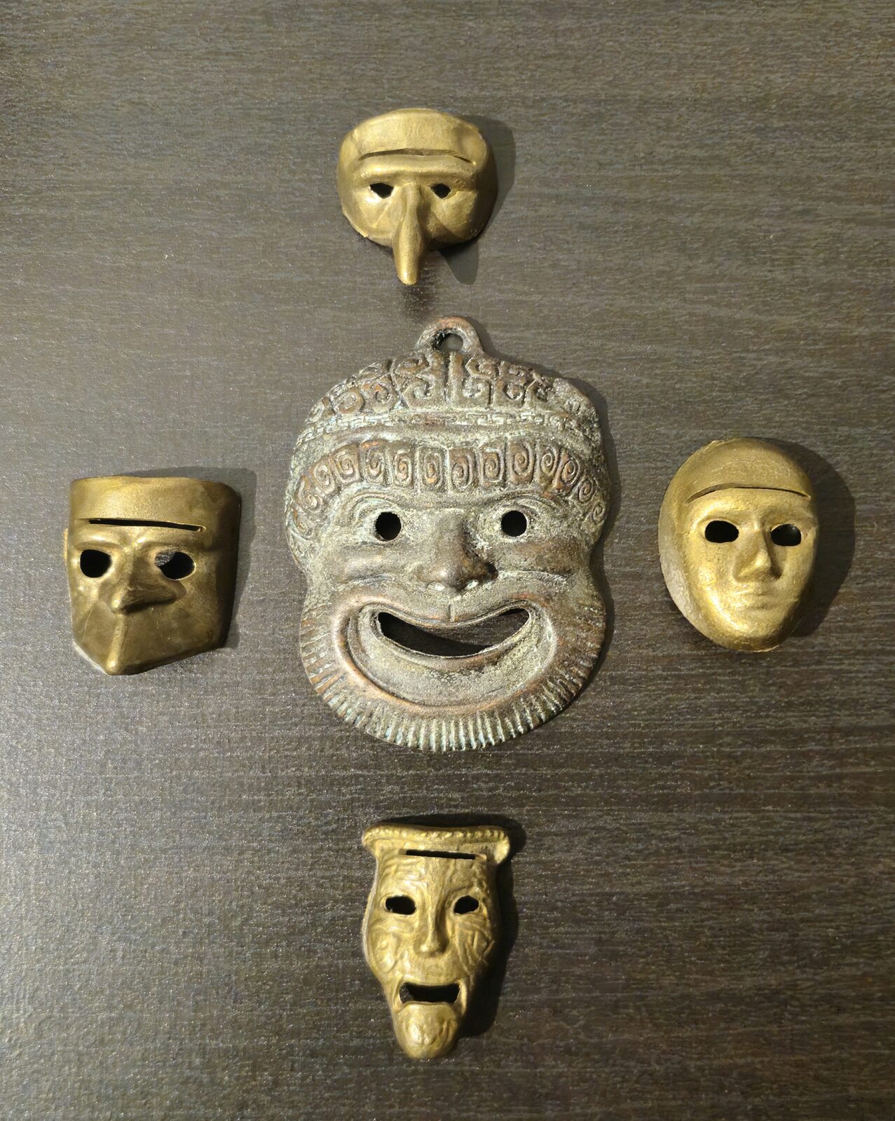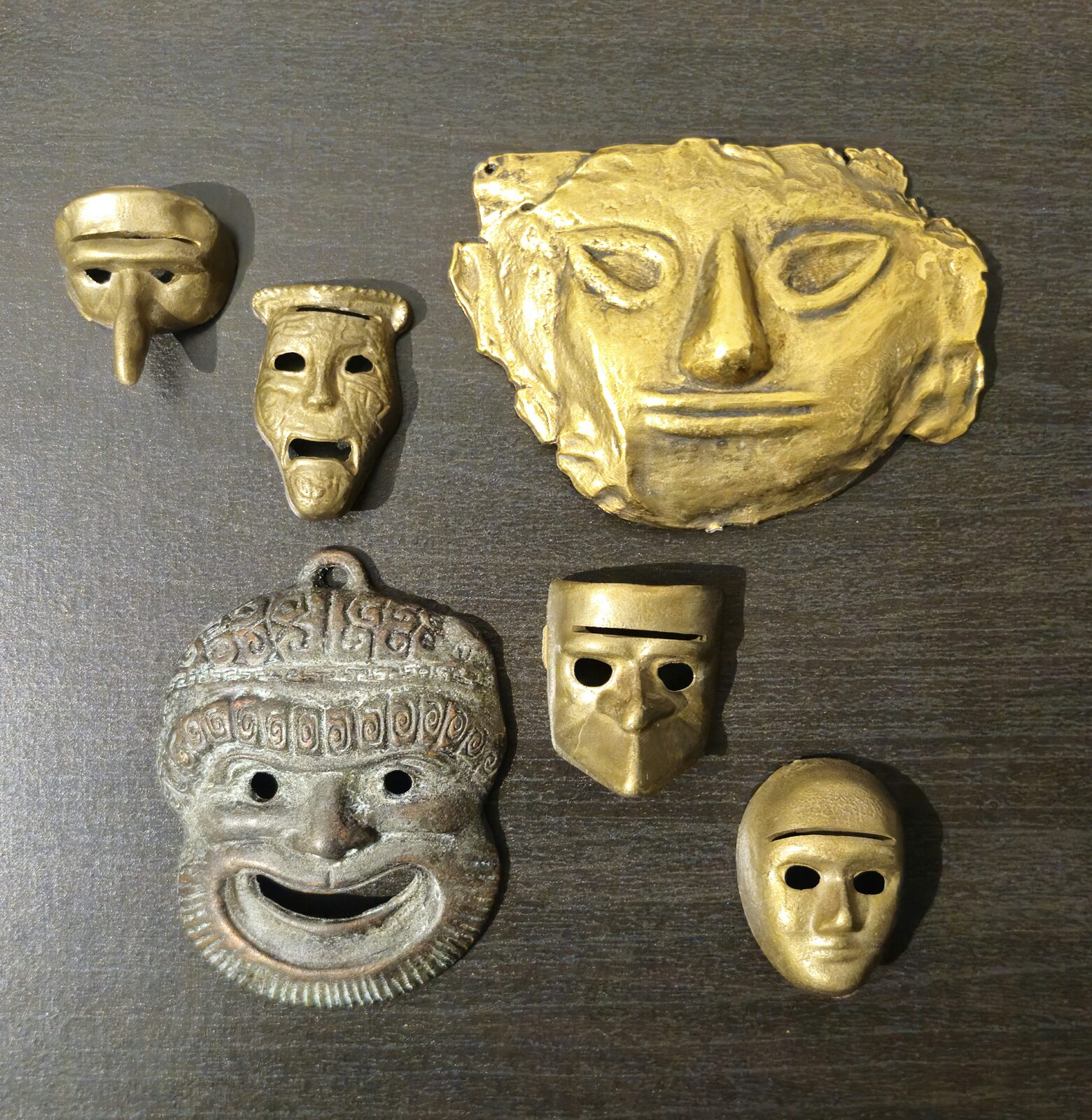 A mixed collection of small metal masks inspired by historical and theatrical traditions. The set includes designs referencing Ancient Greek comedy and tragedy, Roman theatre, Italian Commedia dell’Arte, and Pre-Columbian iconography.