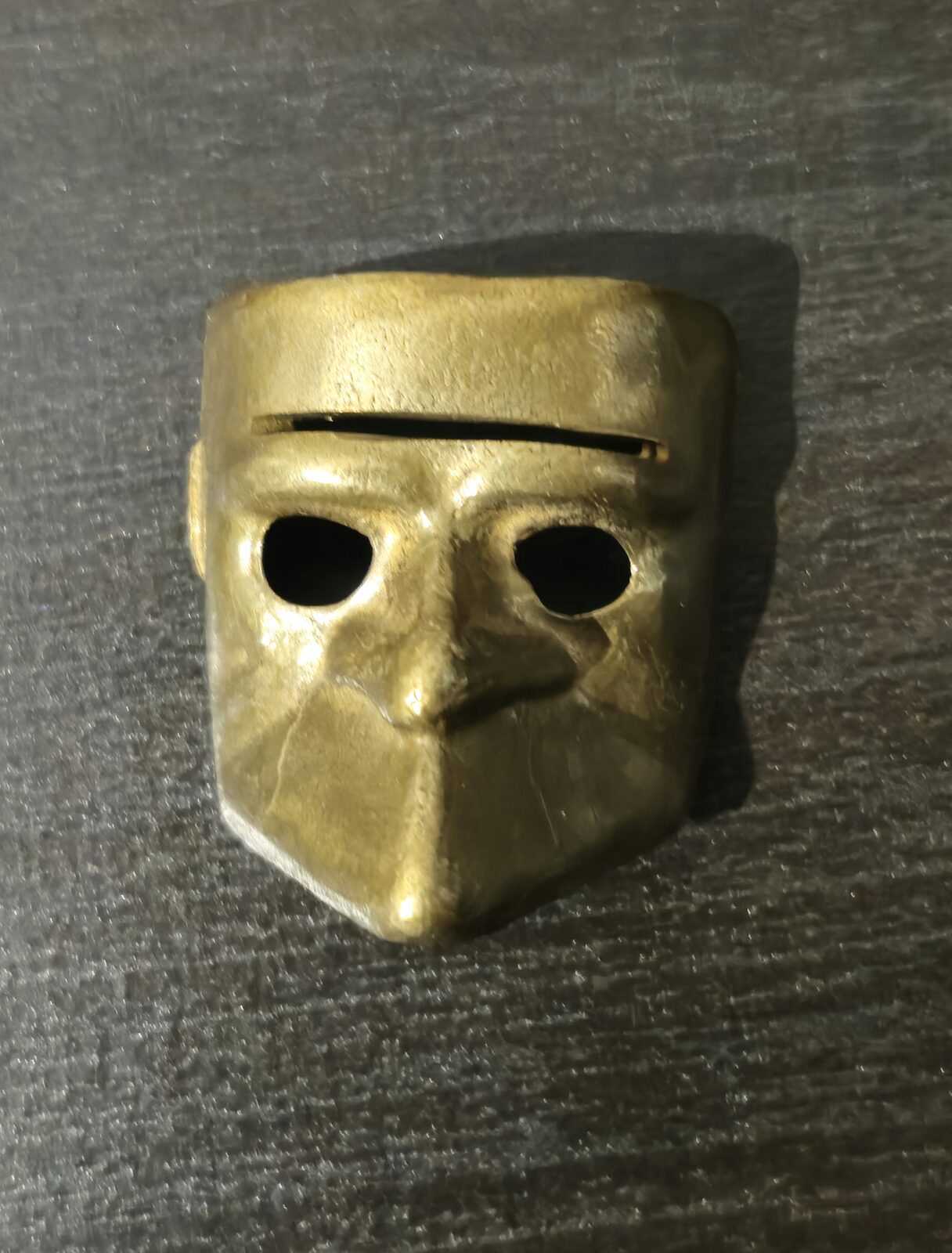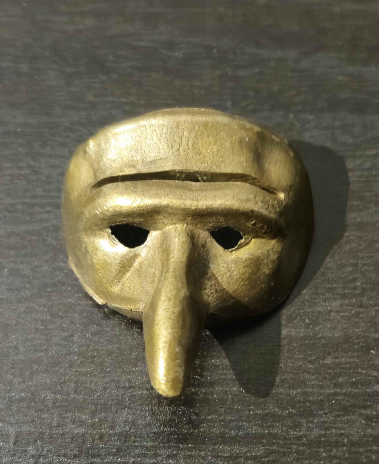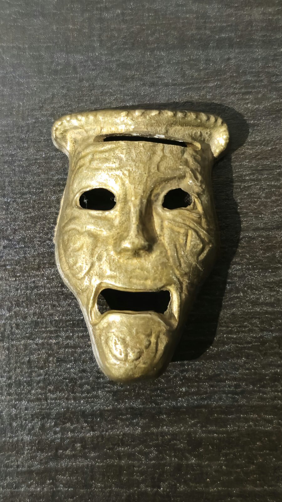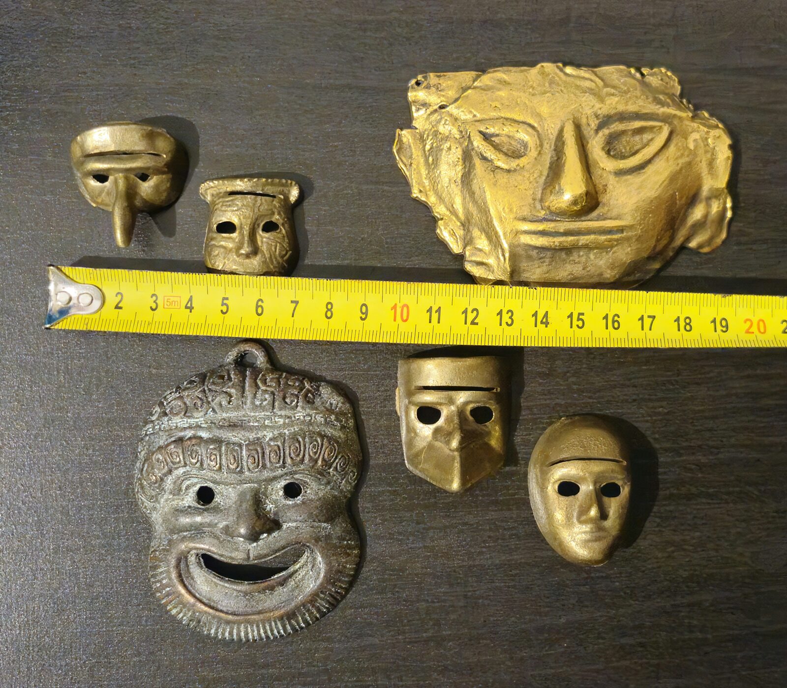 A mixed collection of small metal masks inspired by historical and theatrical traditions. The set includes designs referencing Ancient Greek comedy and tragedy, Roman theatre, Italian Commedia dell’Arte, and Pre-Columbian iconography.