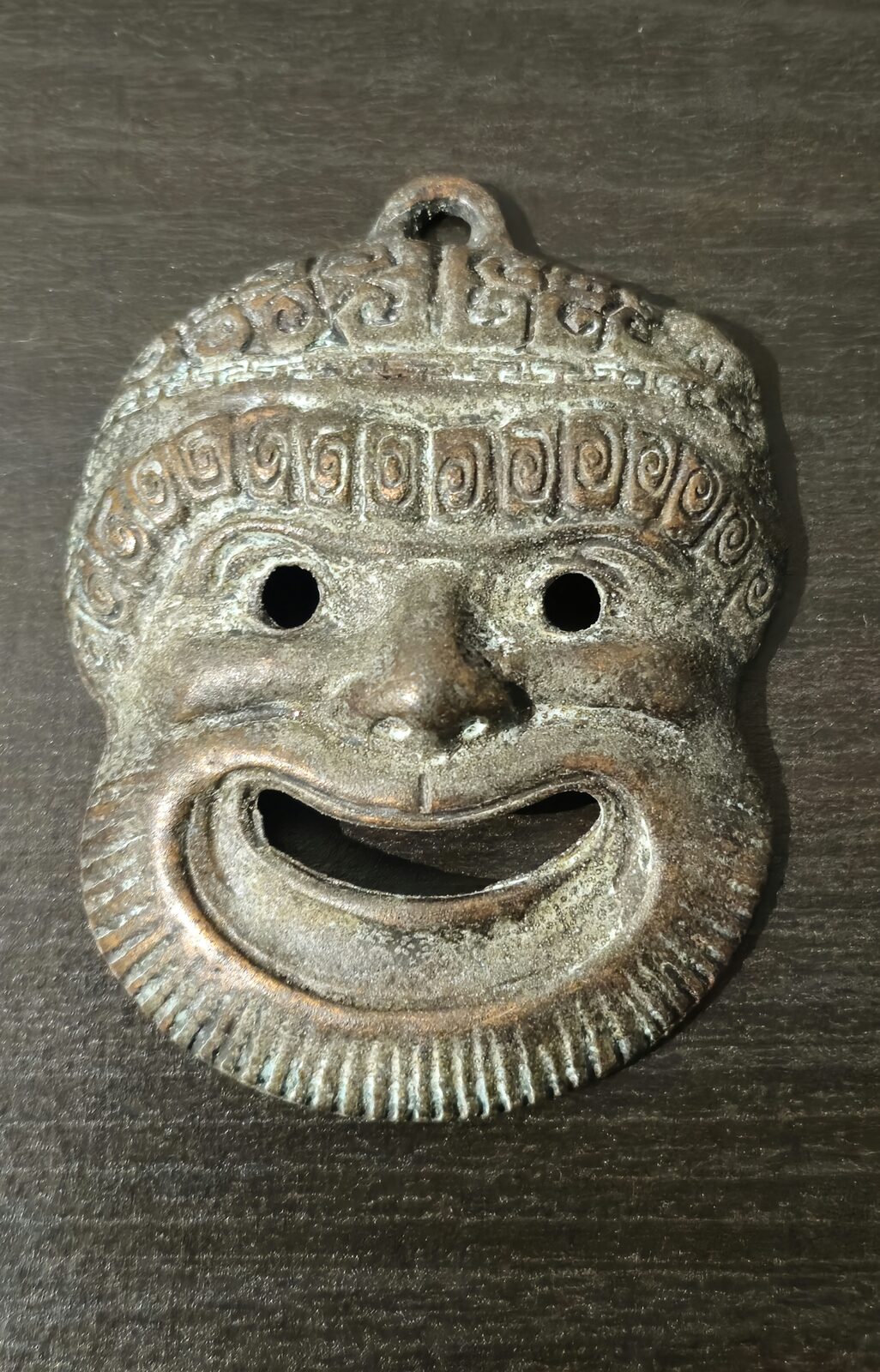 Each mask is cast in brass or bronze alloy with either a gold-toned or antique patinated finish.