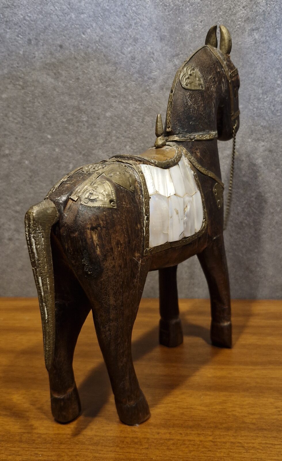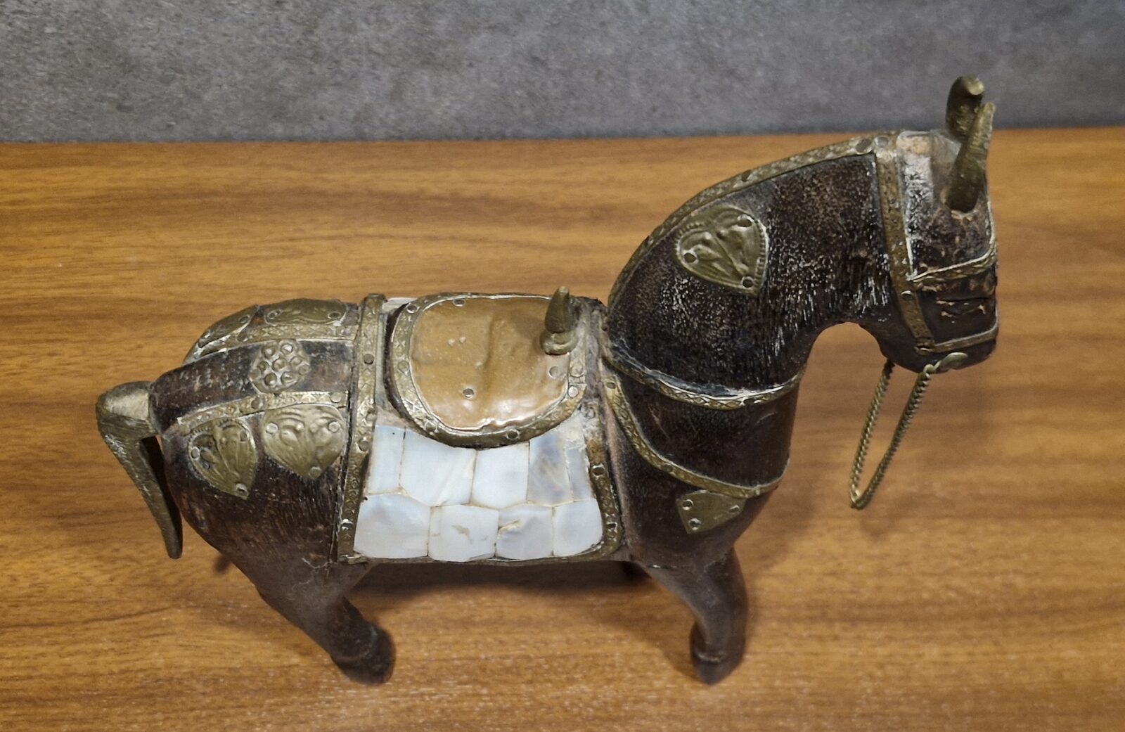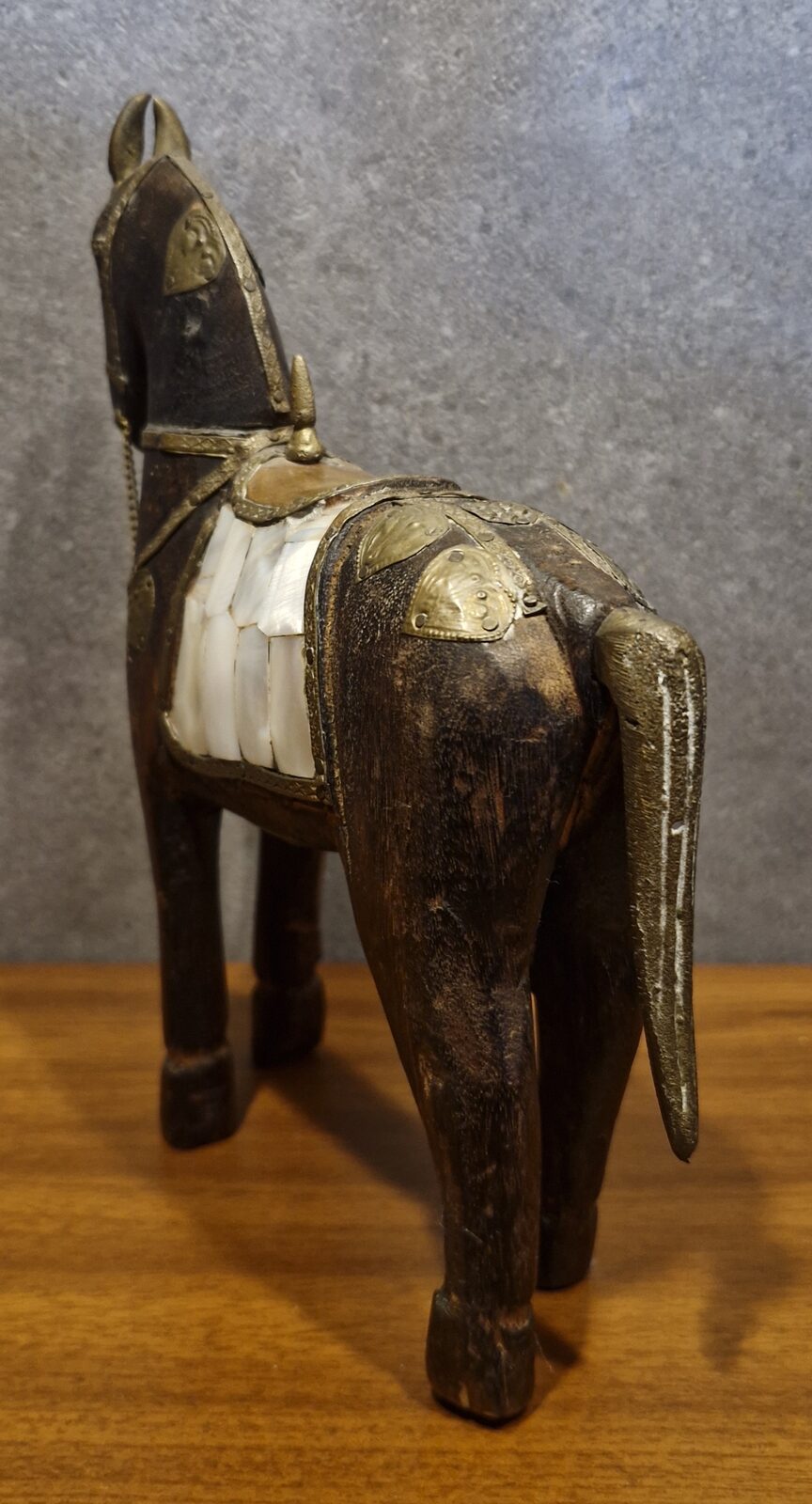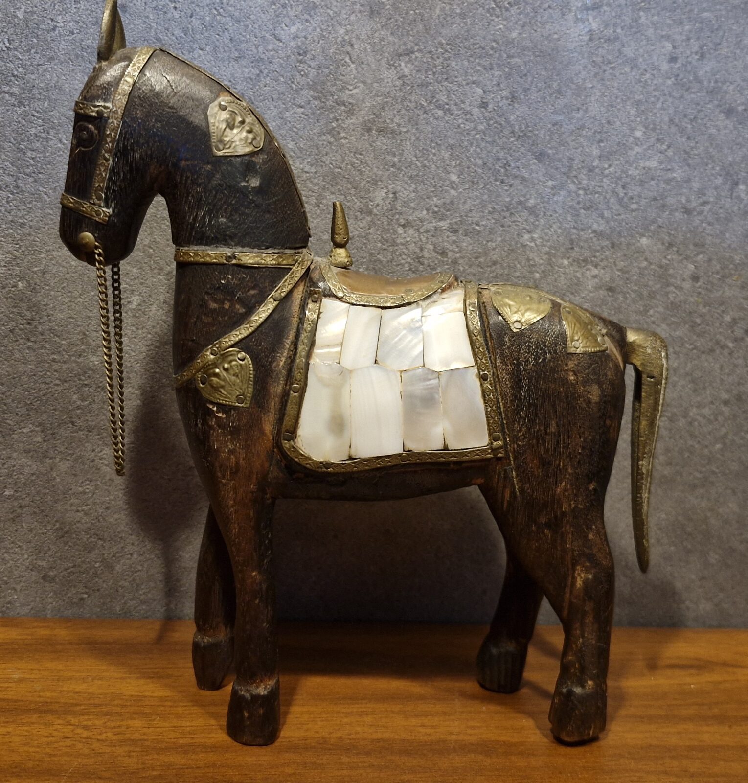 Beautifully detailed hand-carved wooden horse adorned with copper fittings and mother-of-pearl inlay. Likely mid-20th century Nepalese craftsmanship, showing intricate metalwork and fine decorative accents. A striking vintage piece for collectors or home décor. 21 cm high and 19 am wide.