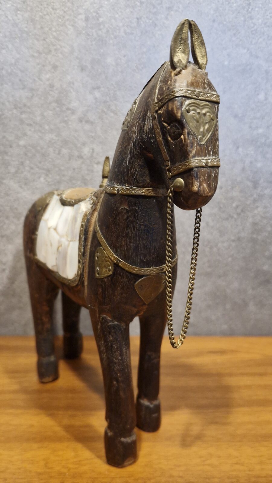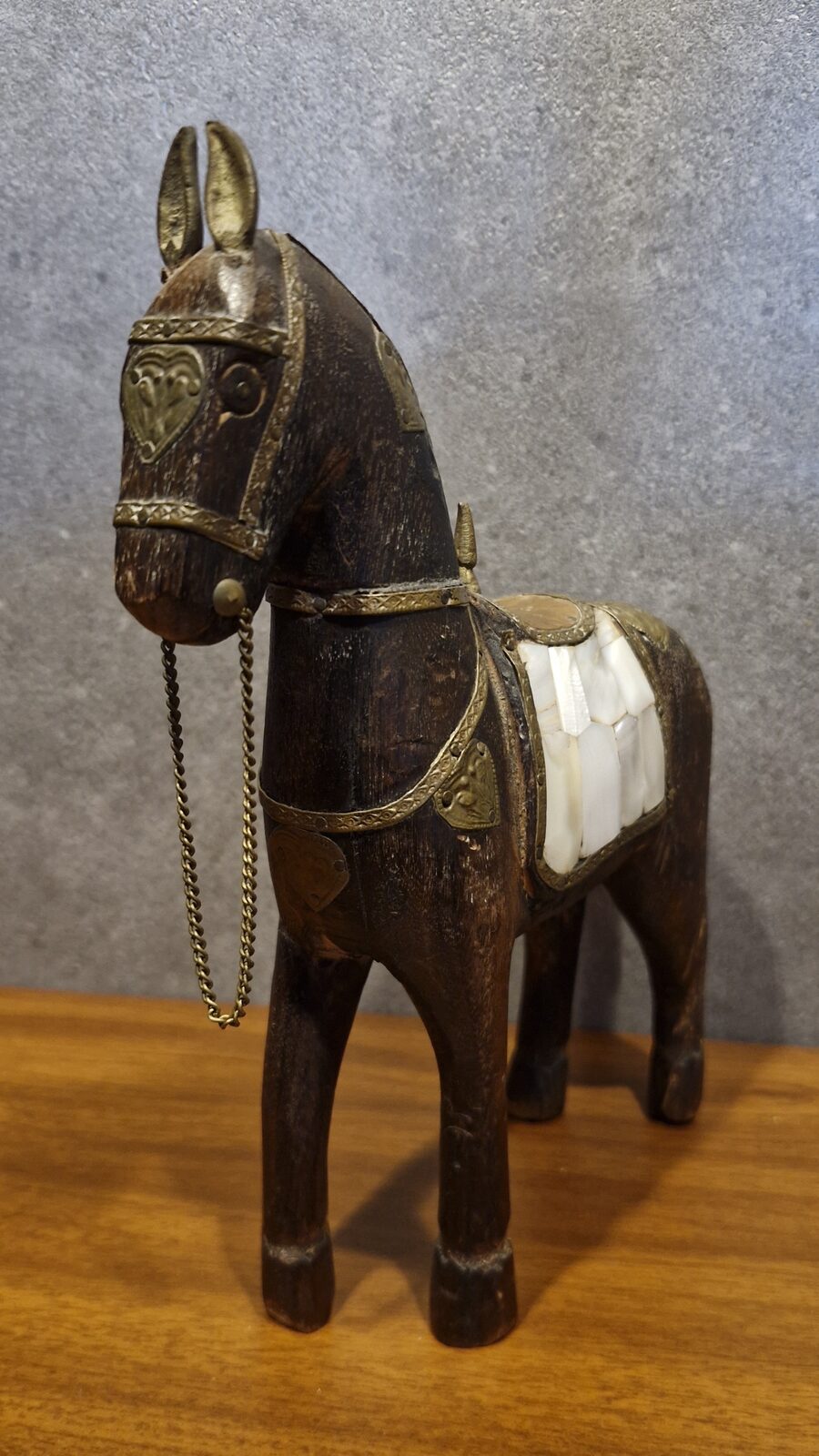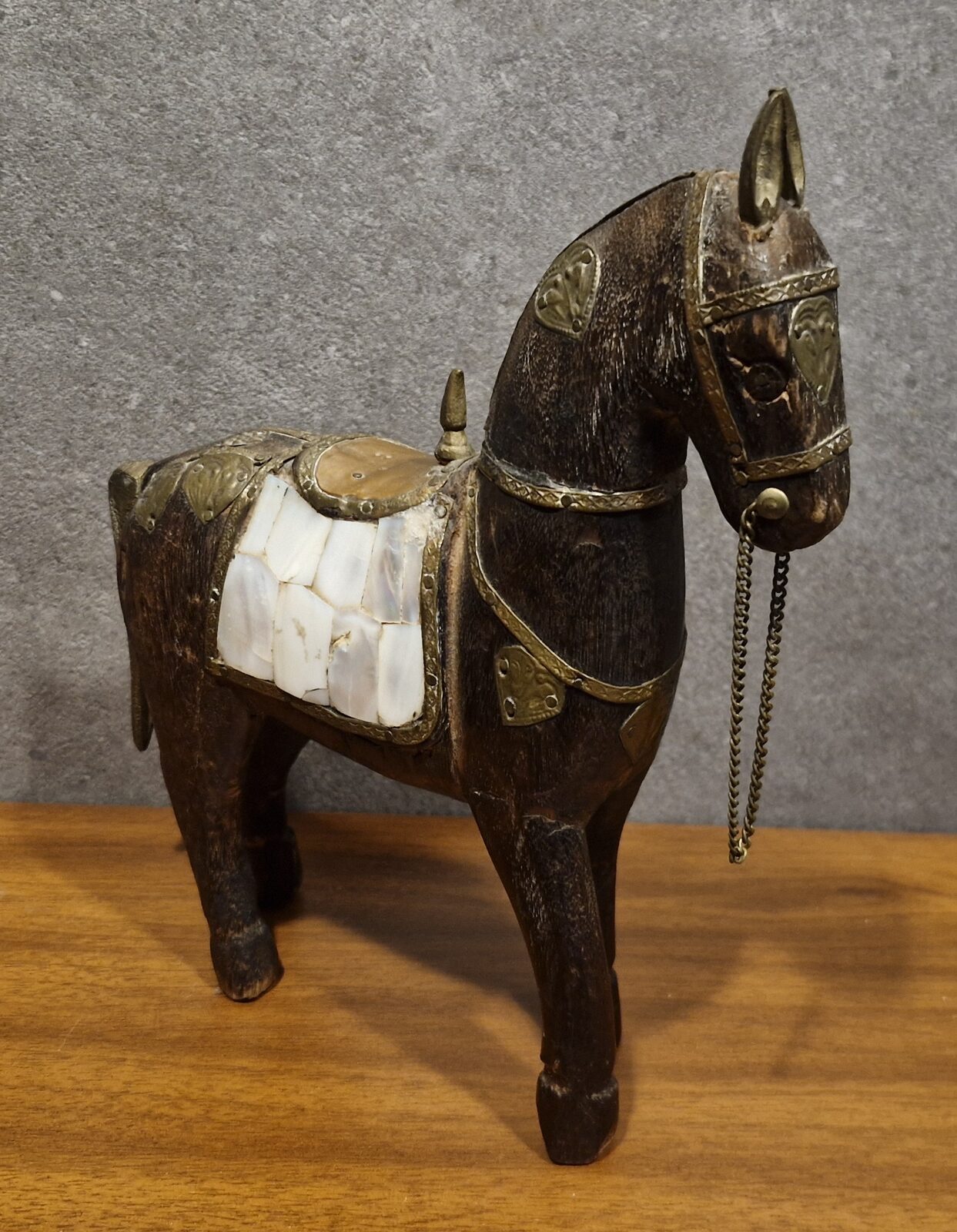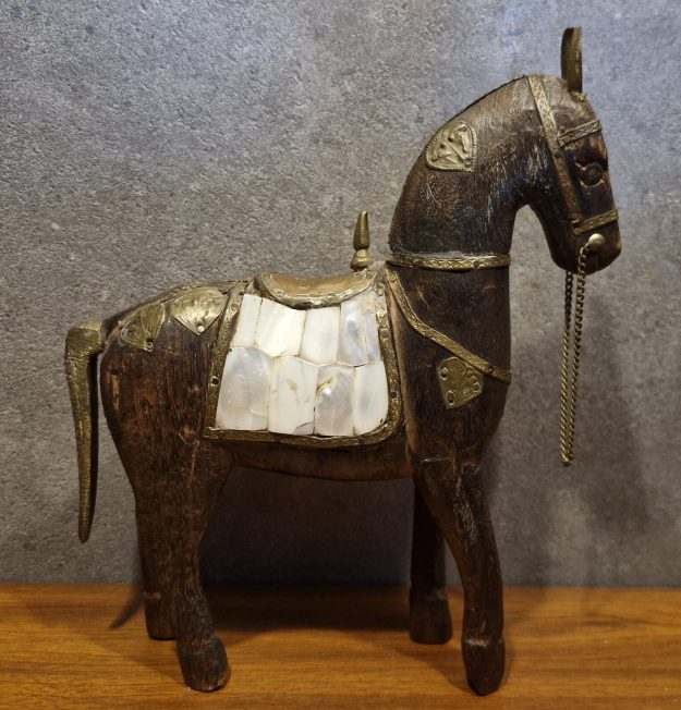 Beautifully detailed hand-carved wooden horse adorned with copper fittings and mother-of-pearl inlay. Likely mid-20th century Nepalese craftsmanship, showing intricate metalwork and fine decorative accents. A striking vintage piece for collectors or home décor. 21 cm high and 19 am wide.
