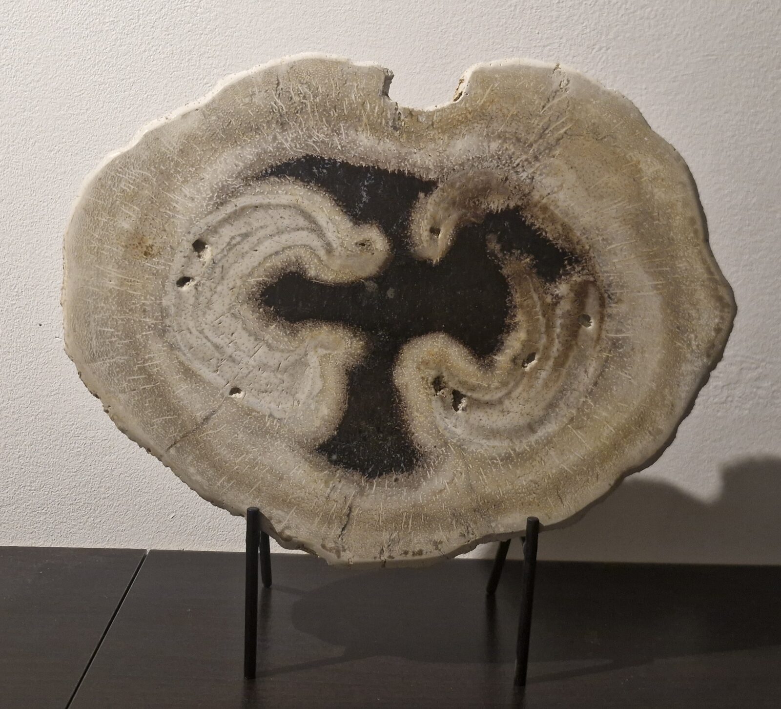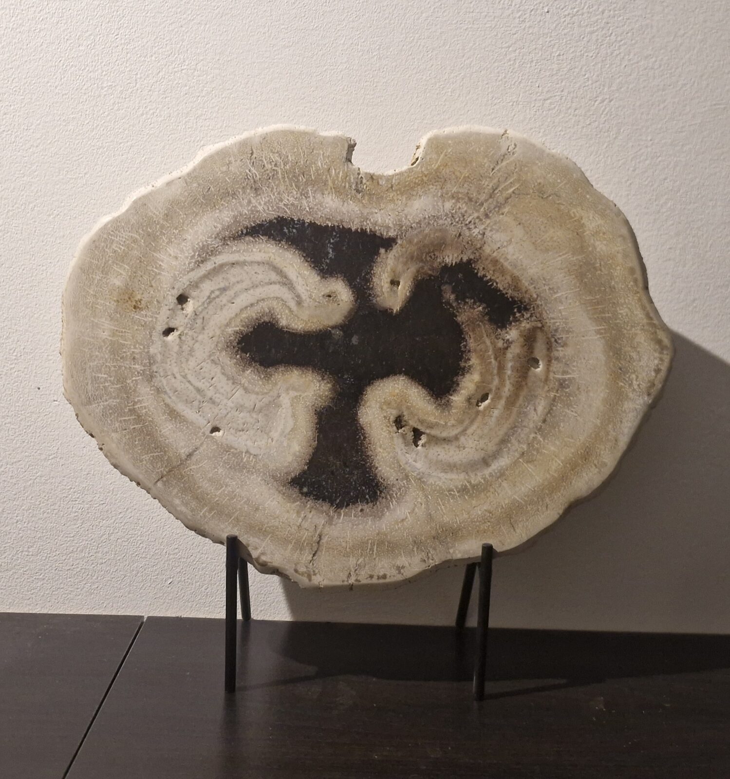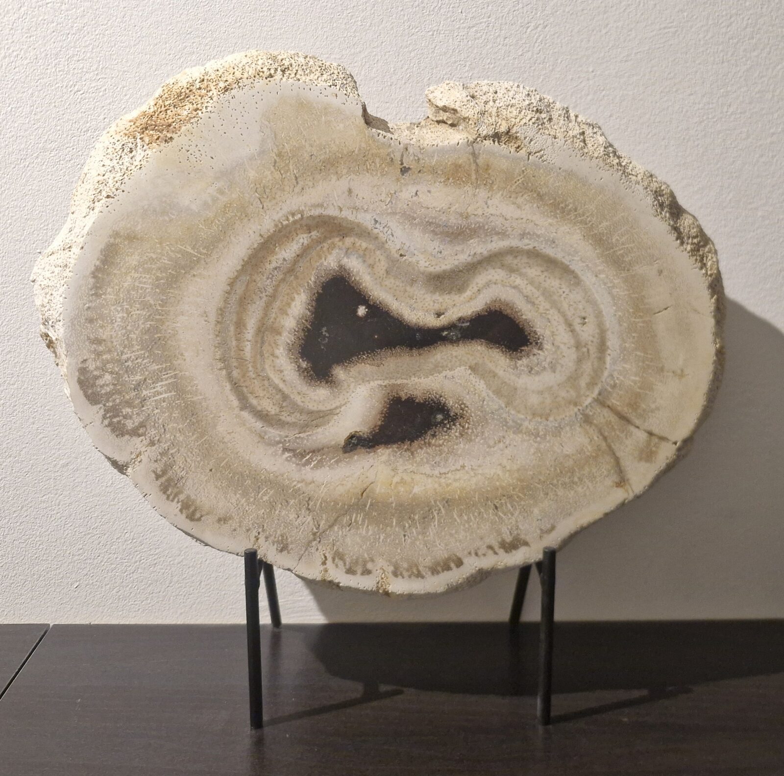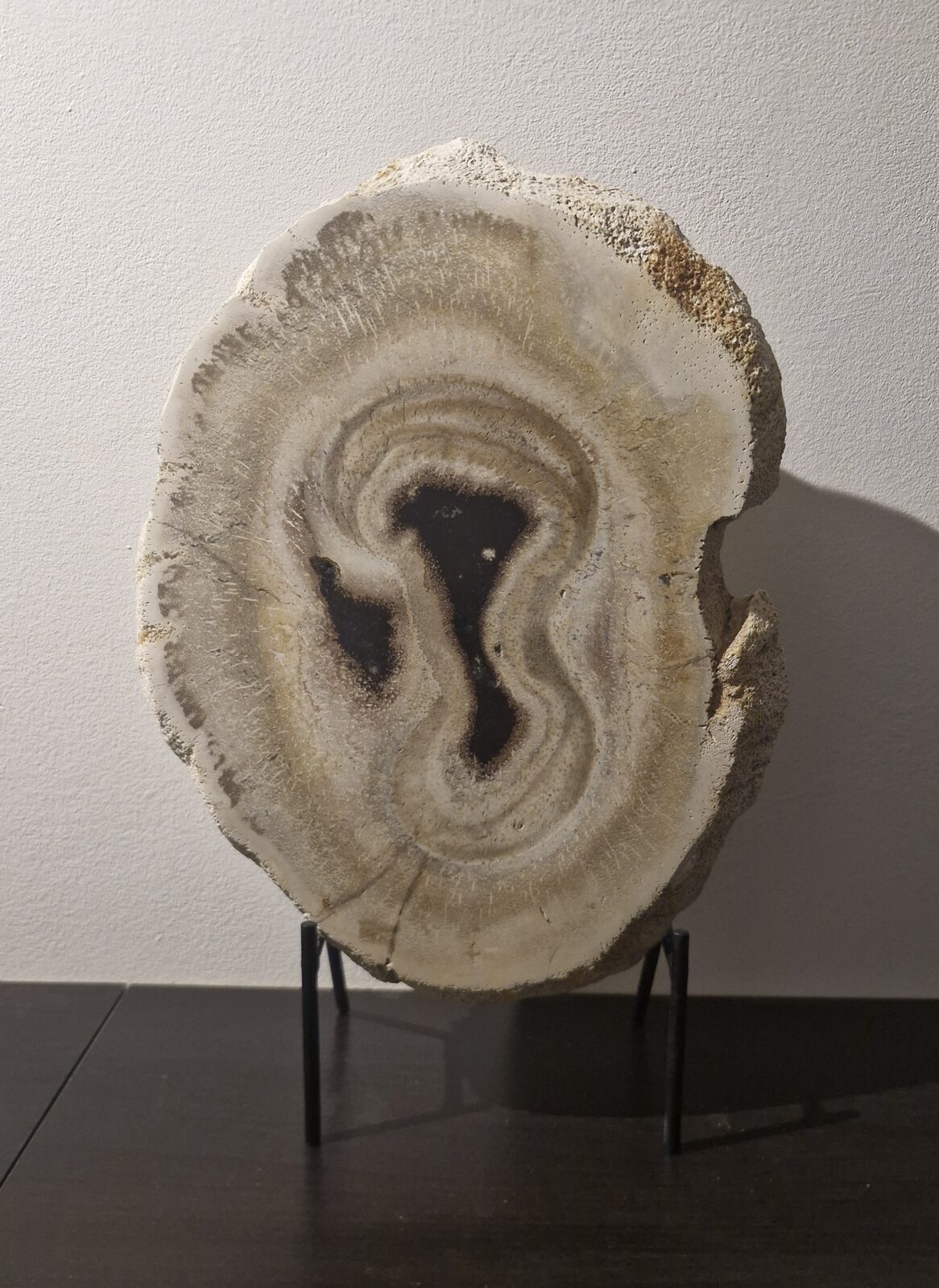 This slab comes with a metal display stand, making it a ready-to-place decorative object for interiors, studios, or natural history collections.