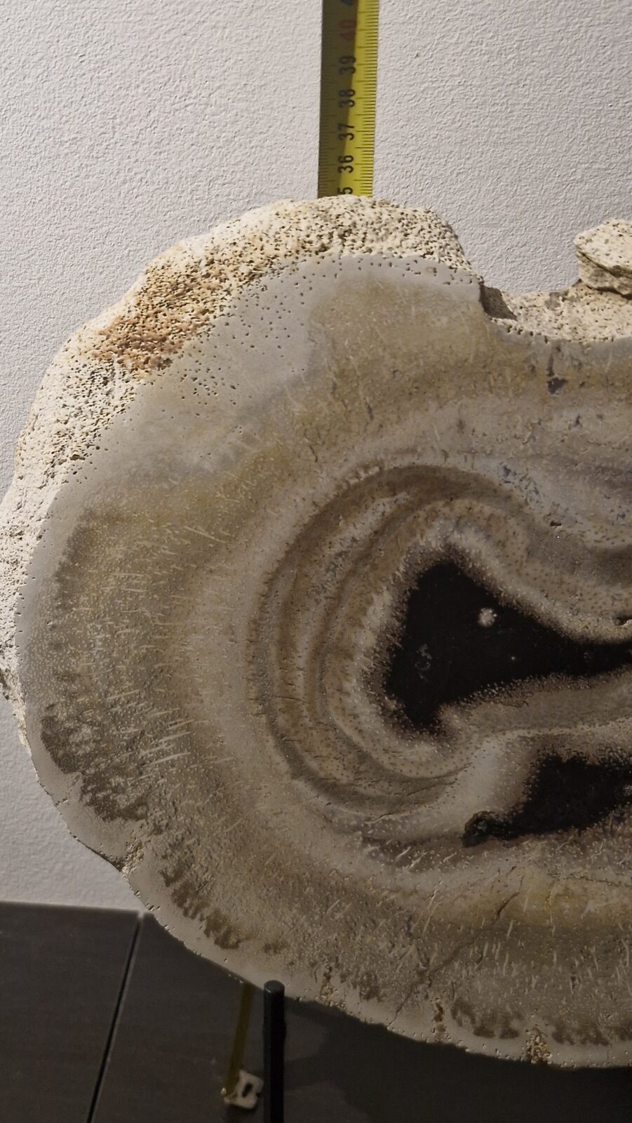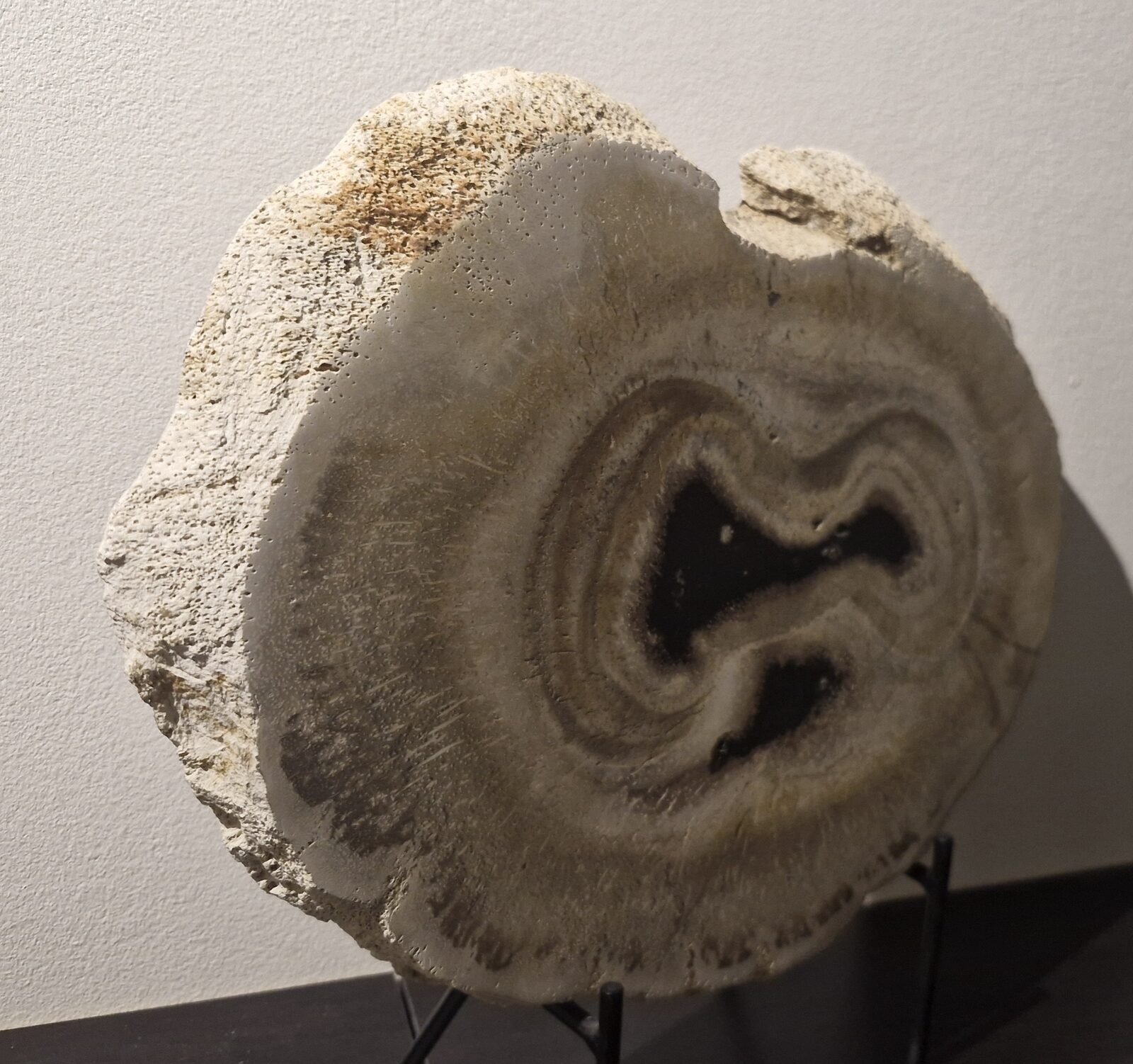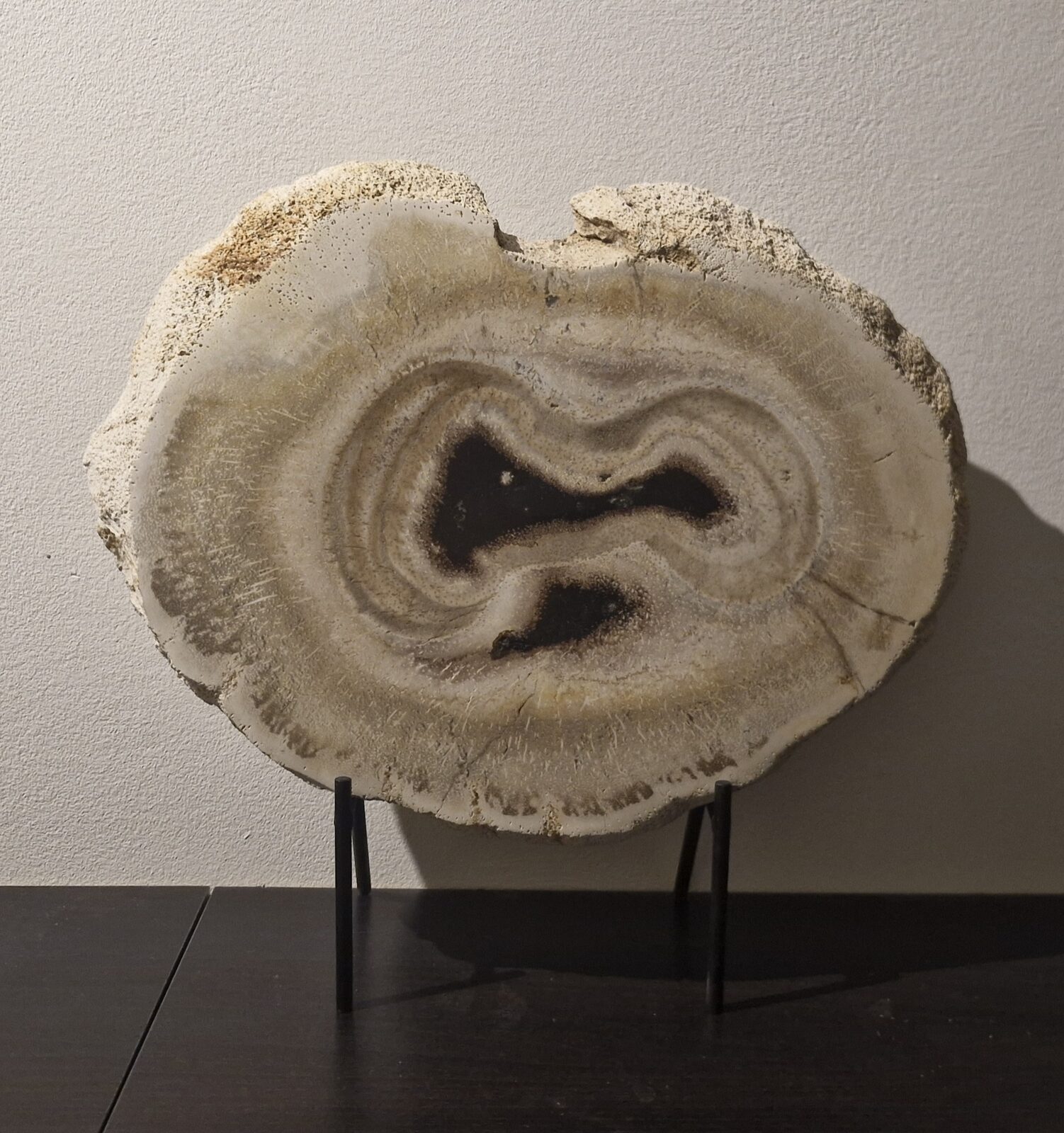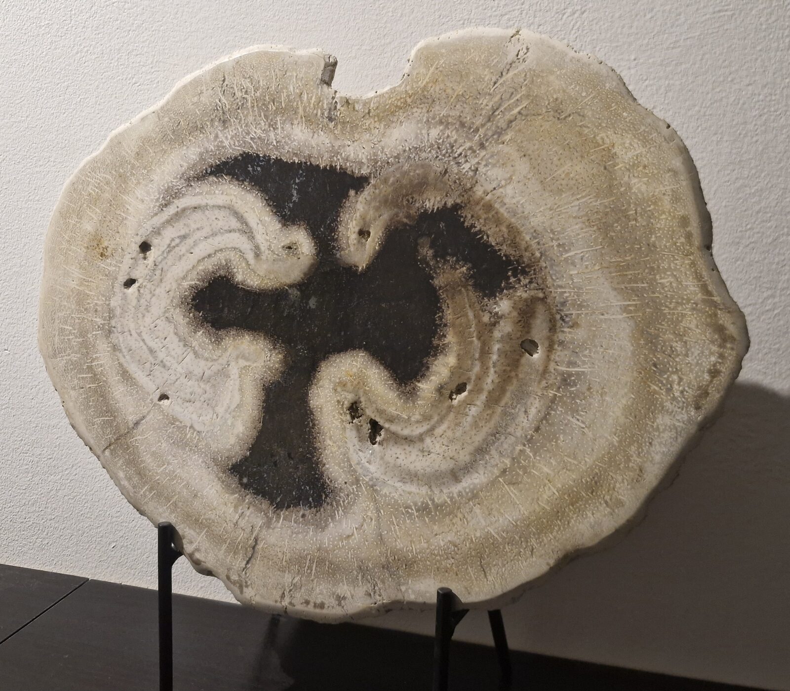 This slab comes with a metal display stand, making it a ready-to-place decorative object for interiors, studios, or natural history collections.