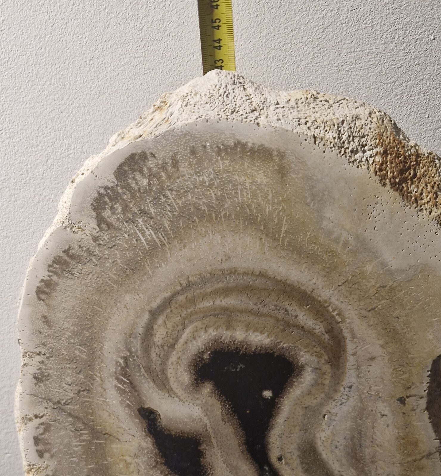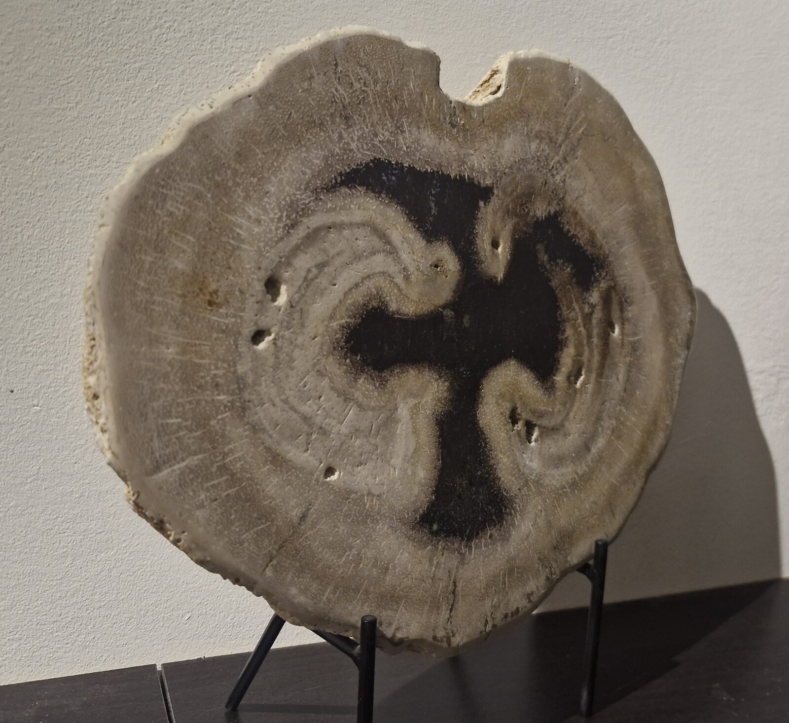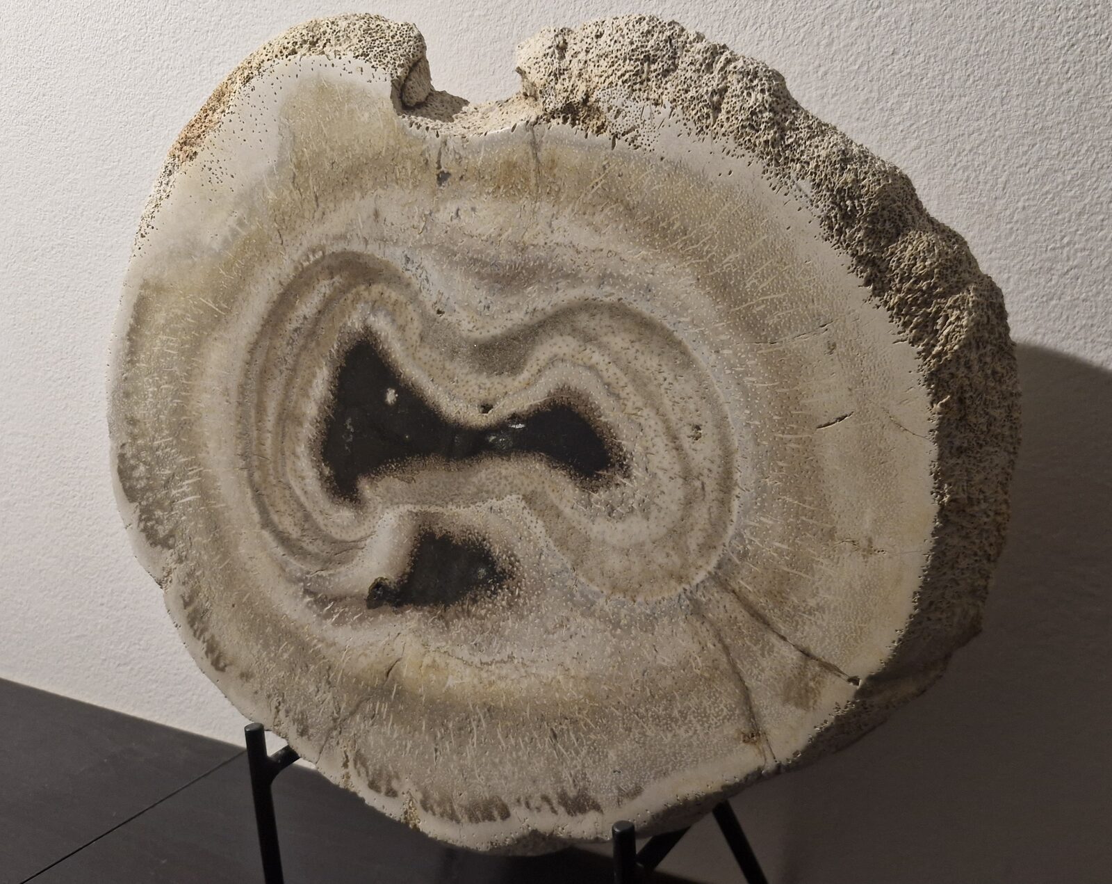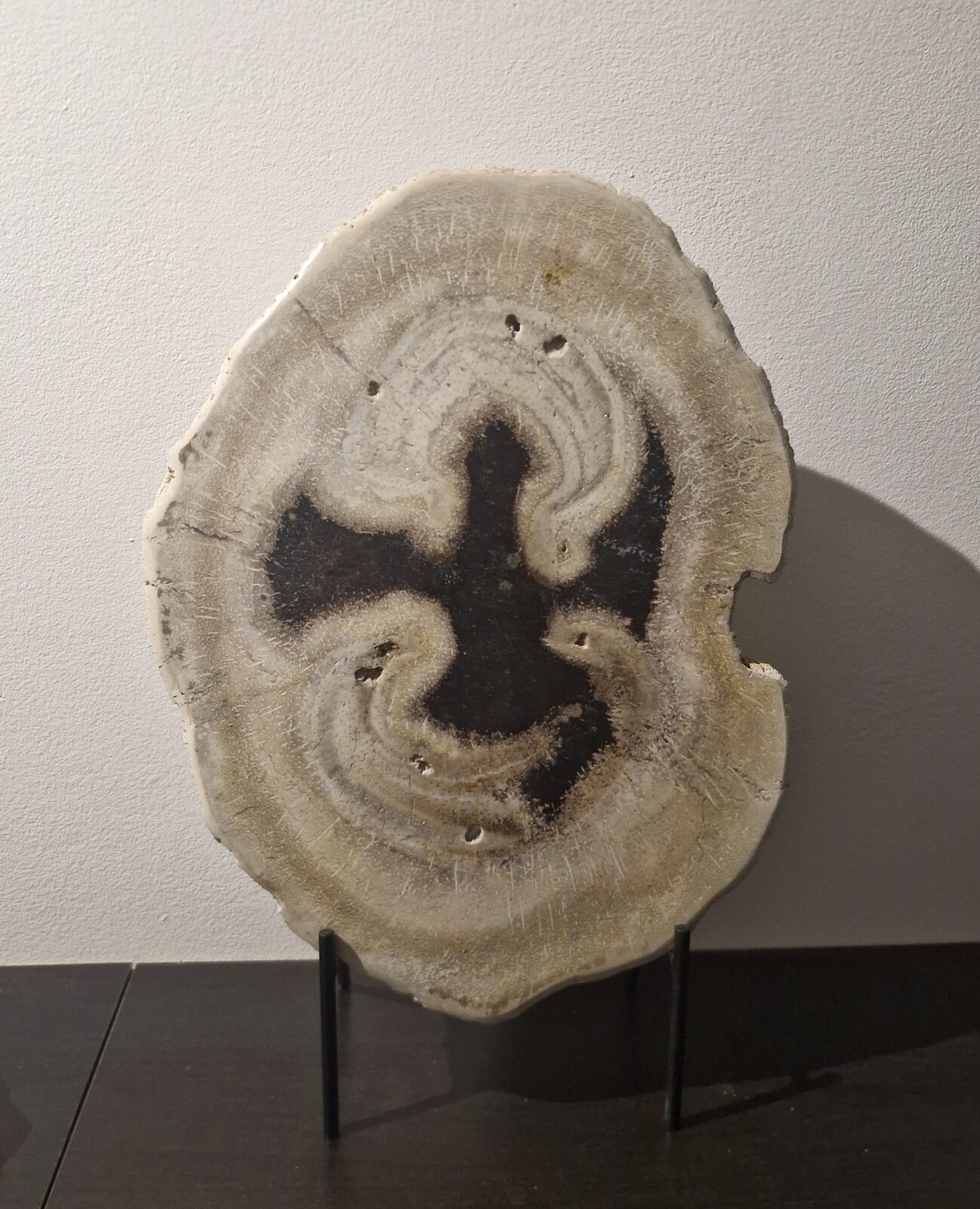 This slab comes with a metal display stand, making it a ready-to-place decorative object for interiors, studios, or natural history collections.