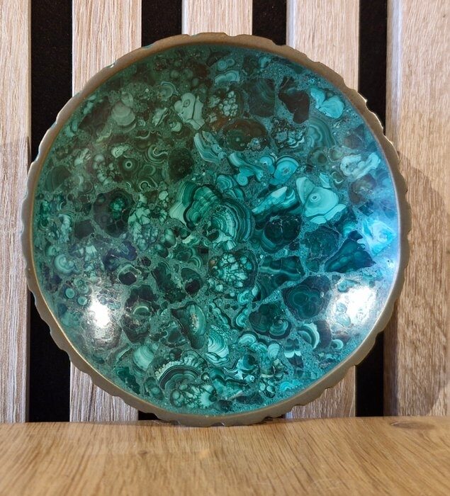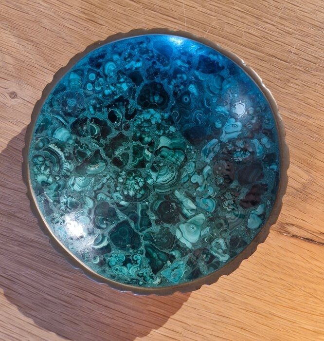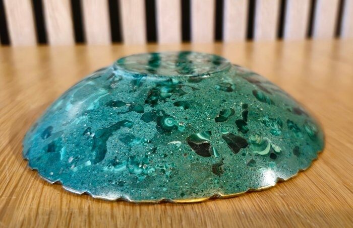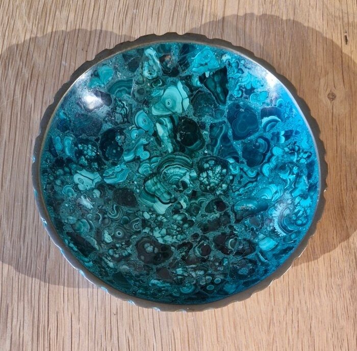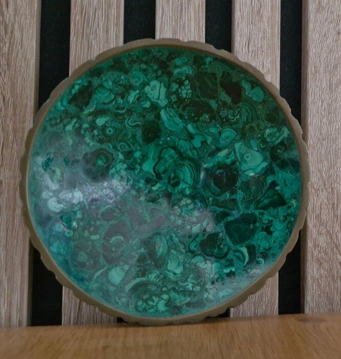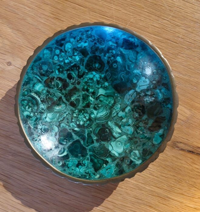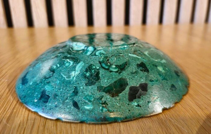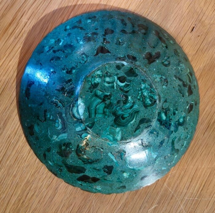 A striking shallow bowl crafted from malachite, displaying the rich green banding and swirling “eyes” characteristic of this beautiful copper-based mineral. The surface shows layers of polished malachite fragments set together, creating a natural mosaic-like pattern that shifts in the light.