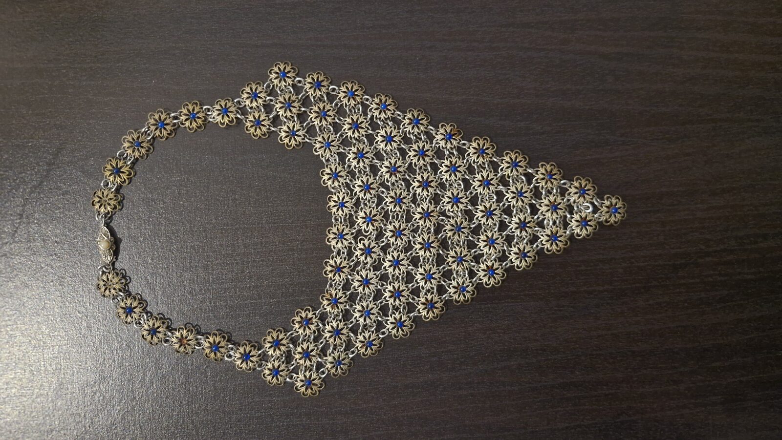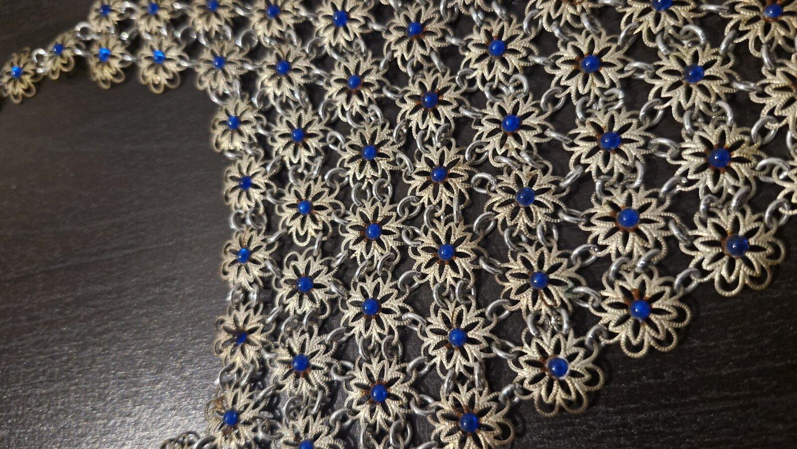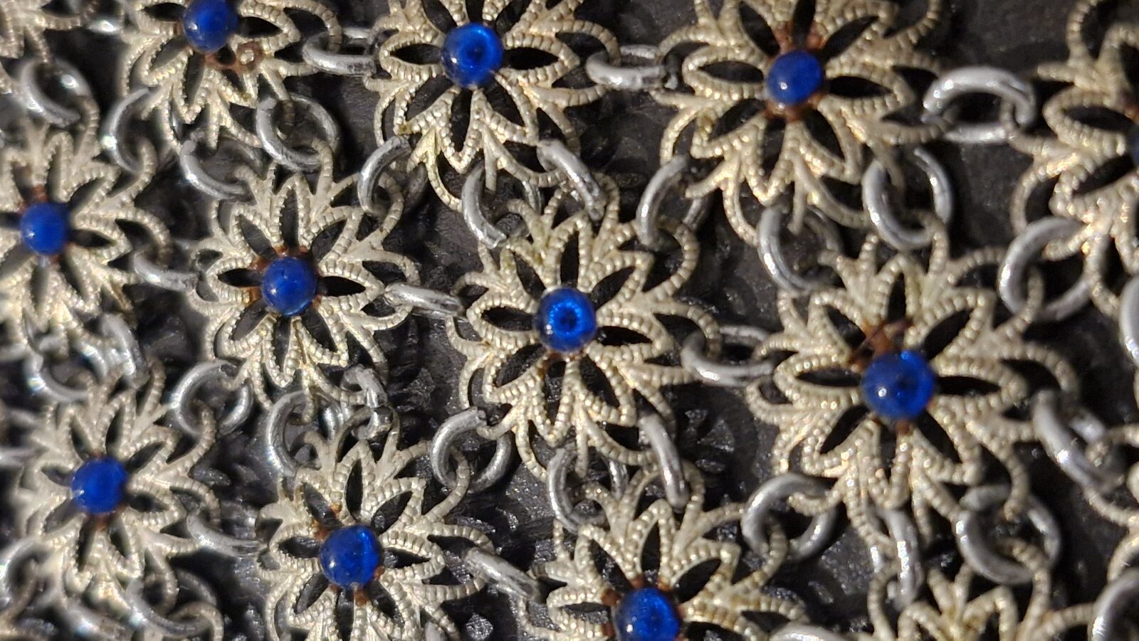 Elegant vintage filigree necklace made from .800 silver, featuring delicate flower links set with blue glass cabochons.
